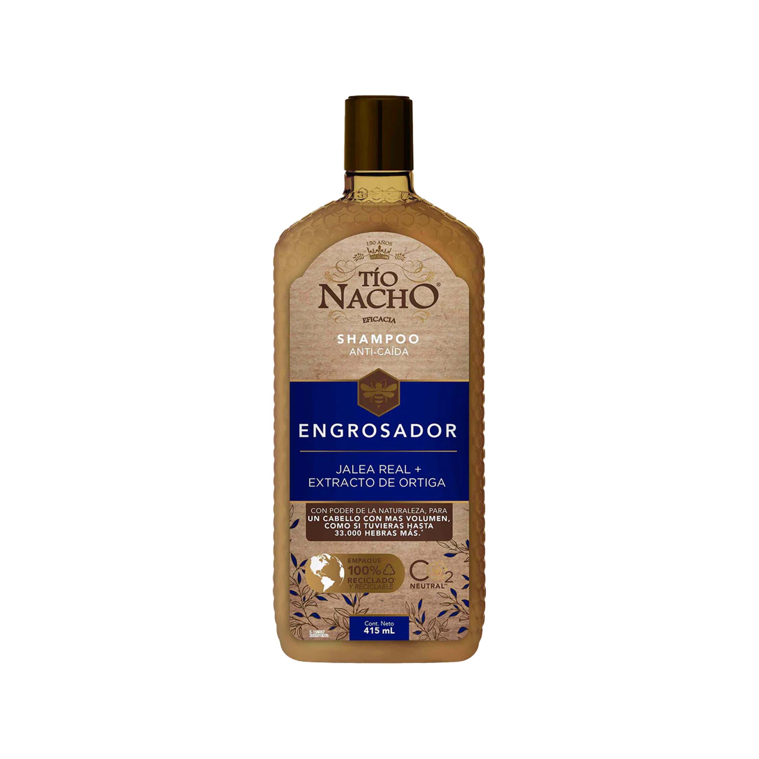 El Shampoo Engrosador Tío Nacho está formulado con jalea real y extracto de ortiga, ingredientes reconocidos por sus propiedades beneficiosas para el cabello. Este shampoo está diseñado para dar más cuerpo y volumen a cabellos finos y débiles, ayudando a que se sientan más robustos y saludables. La jalea real nutre y revitaliza el cuero cabelludo, mientras que el extracto de ortiga contribuye a fortalecer los folículos pilosos, promoviendo un crecimiento más denso y sano. Su uso regular puede resultar en un cabello más lleno y con mayor apariencia de grosor.