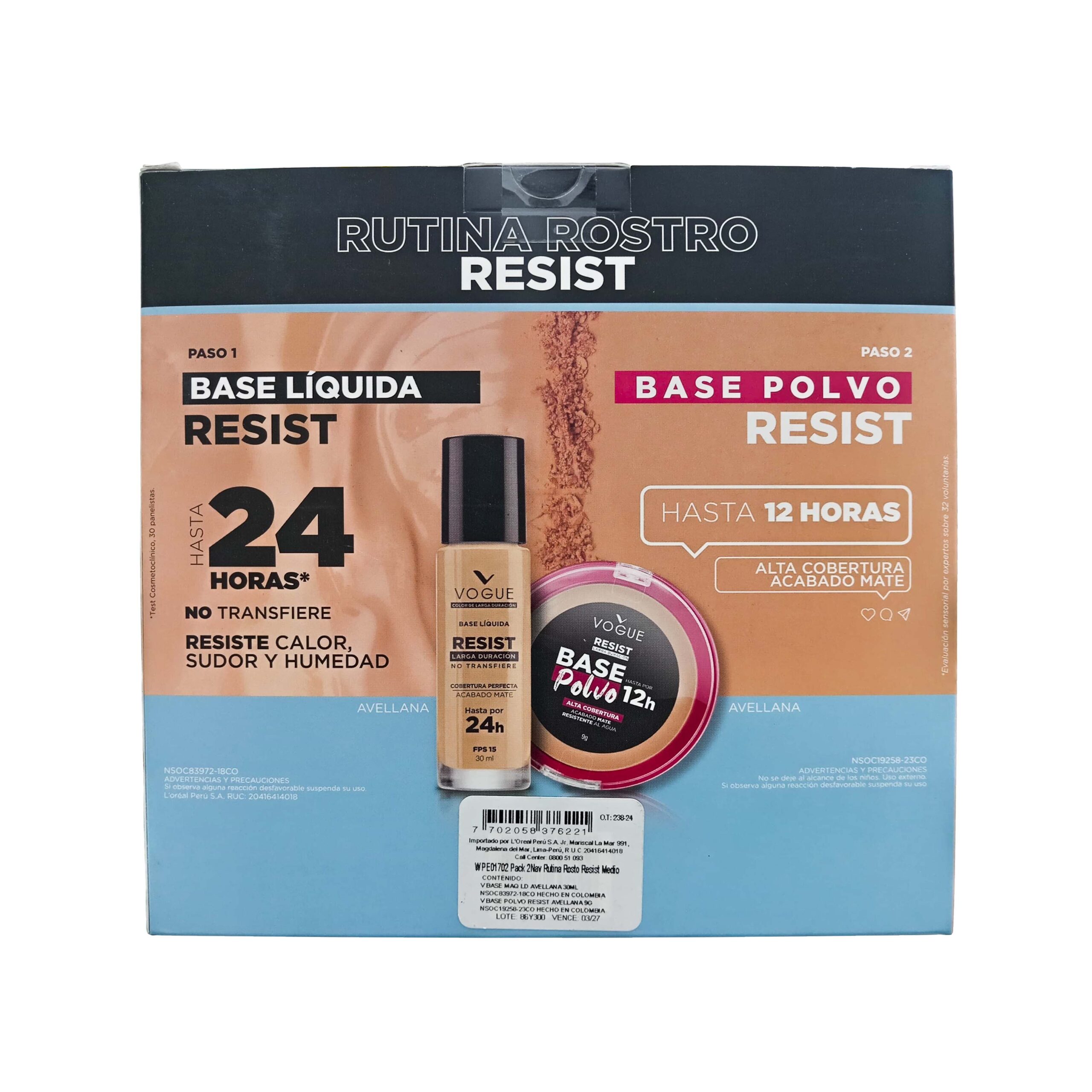 Este producto es un pack promocional de la línea Rutina Rostro Resist de Vogue, que incluye dos elementos básicos para el maquillaje diario: una base líquida y una base en polvo, ambos diseñados para proporcionar alta cobertura, acabado mate y una larga duración. Es ideal para quienes buscan un maquillaje que se mantenga intacto en condiciones exigentes como calor, humedad o actividades prolongadas.